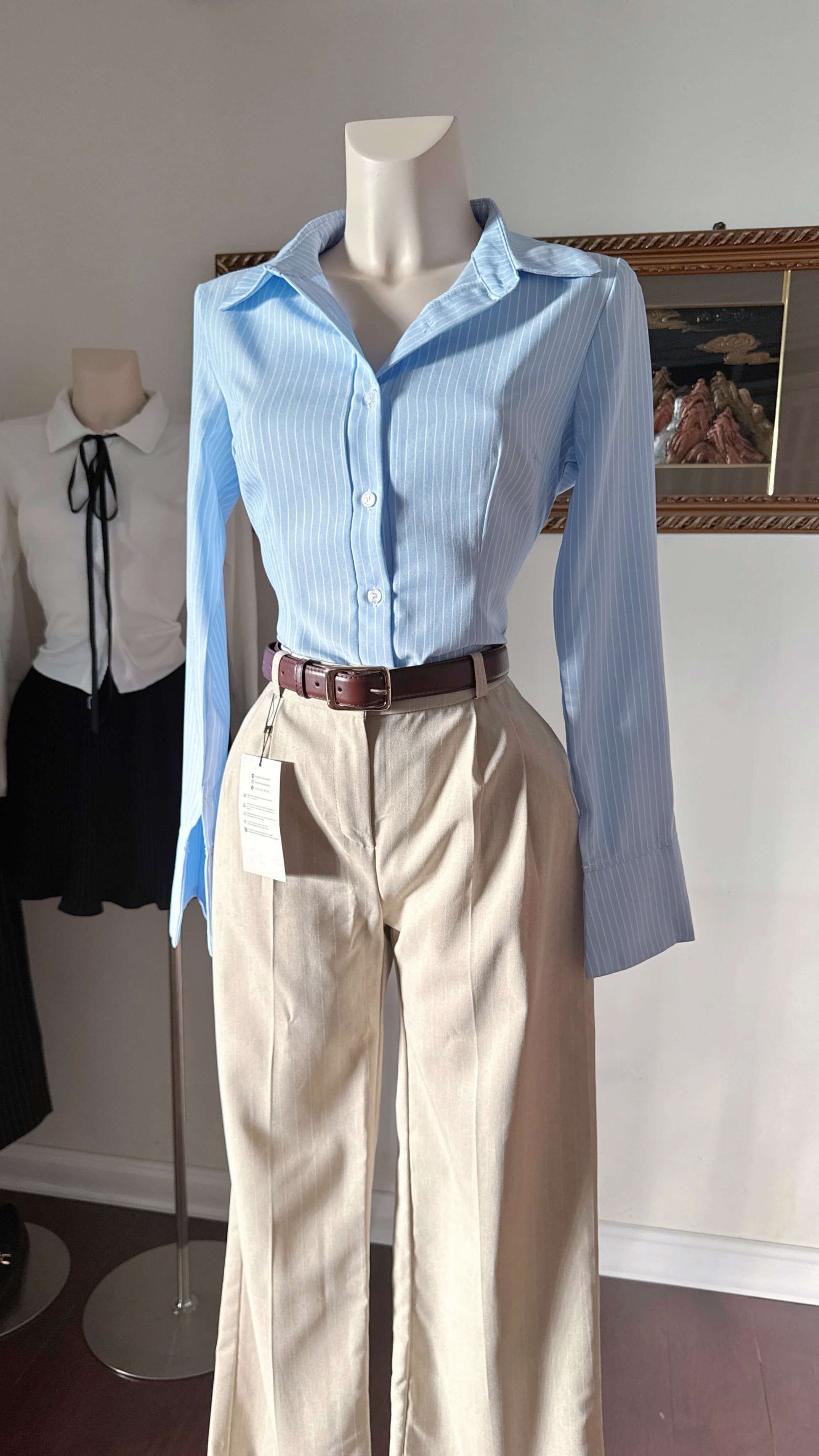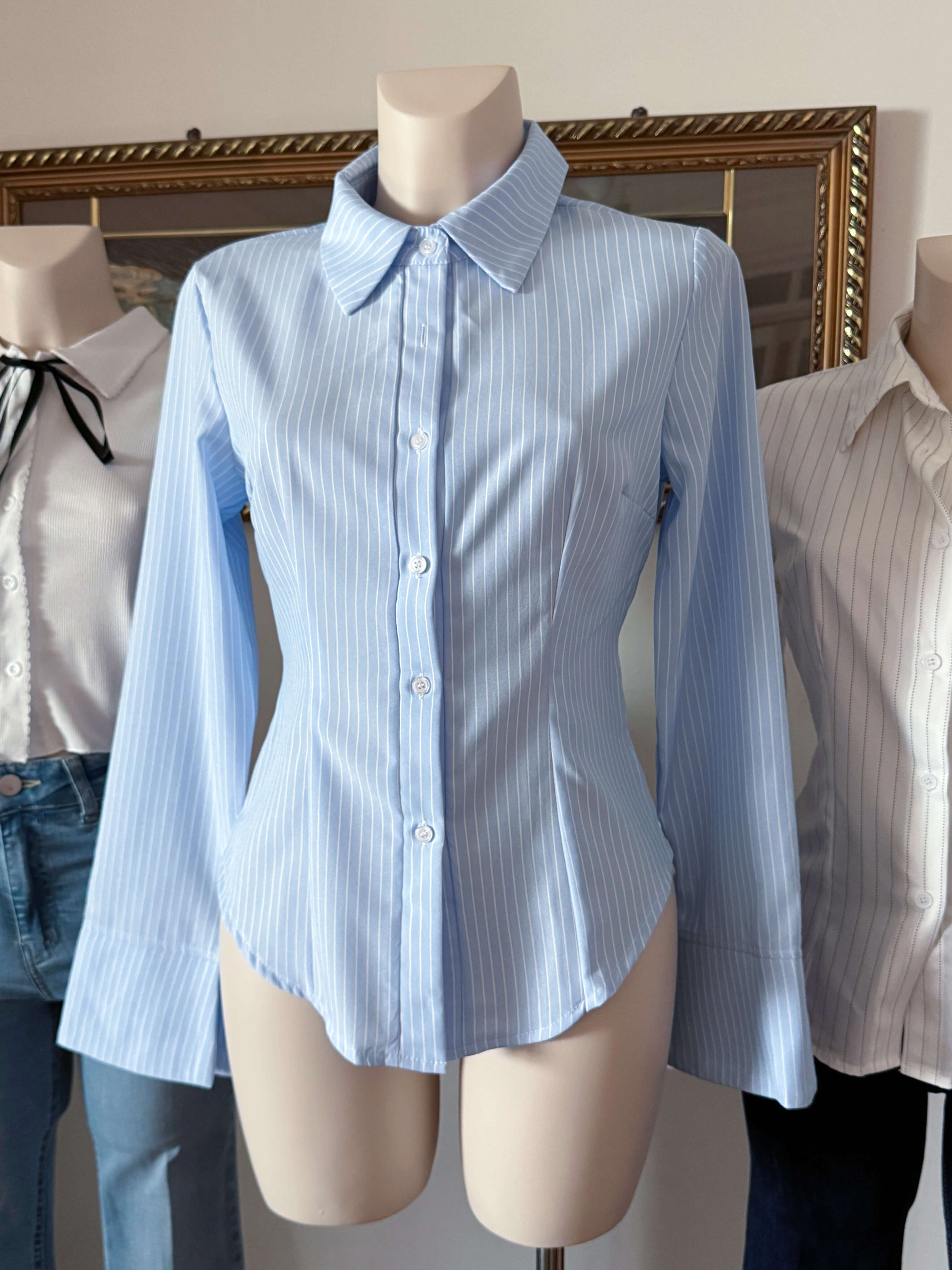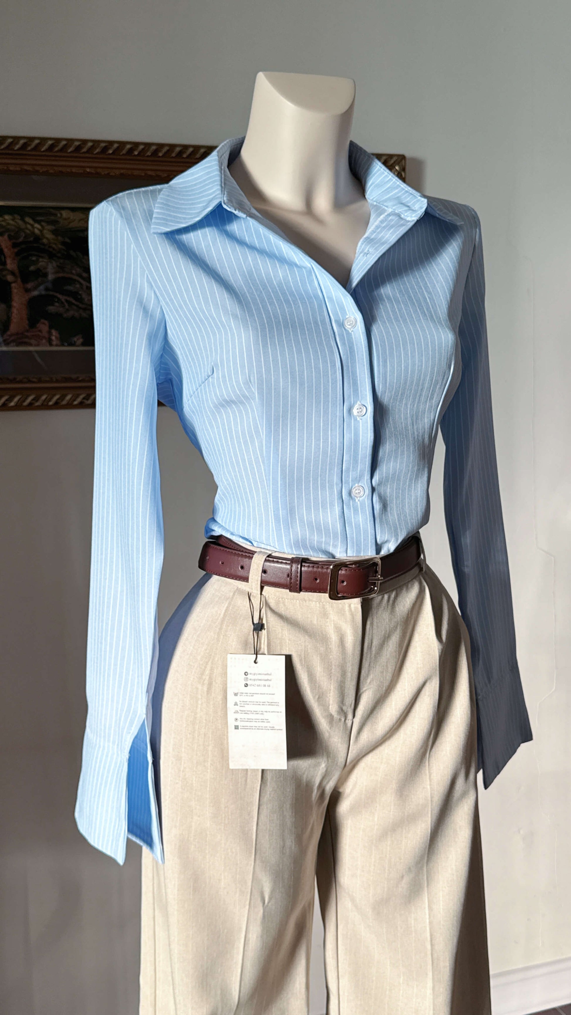 قميص سمائي مخطط امقلم بأزرار، خصر ضيق،